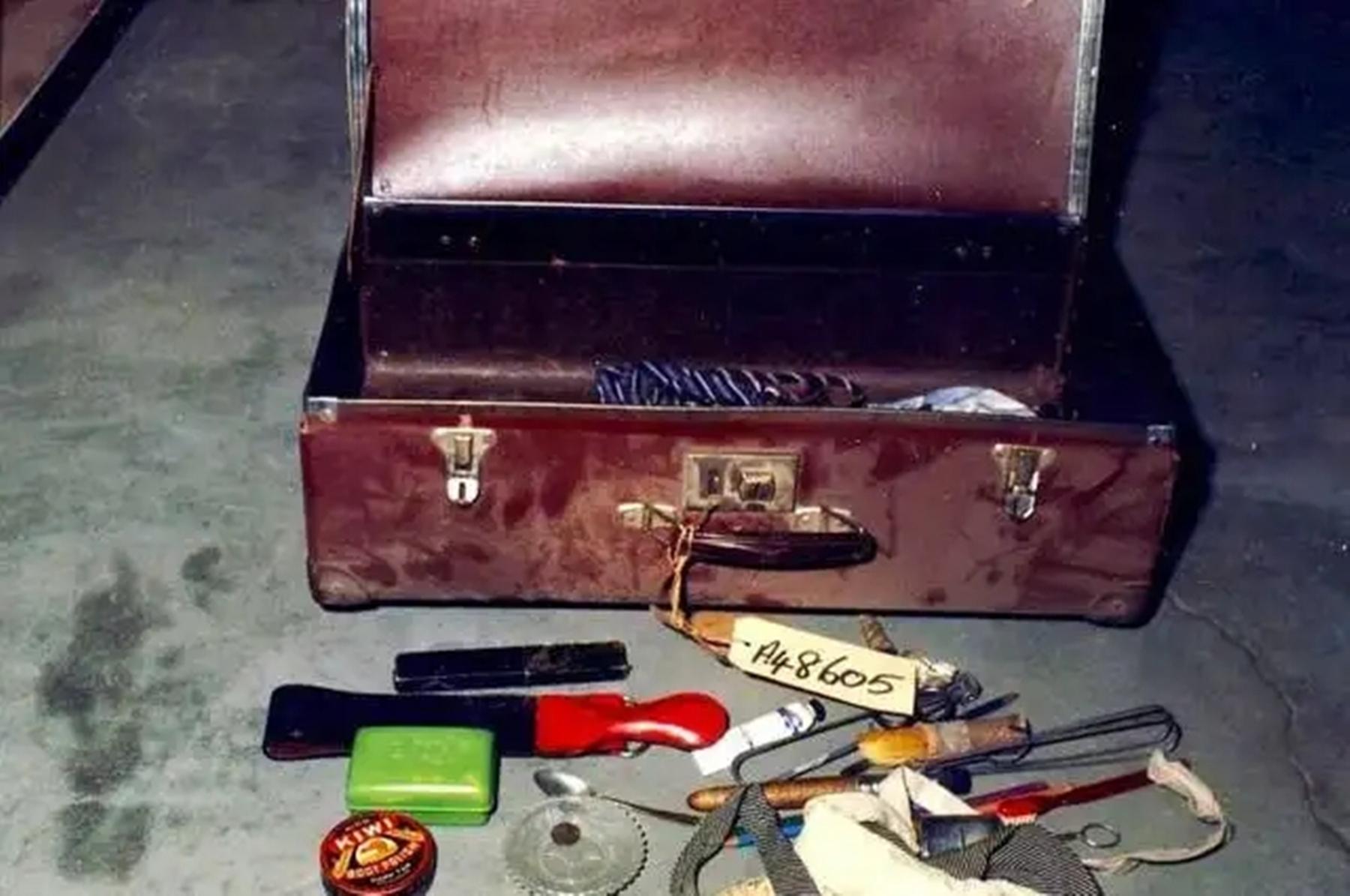 箱子上的标签已经被人取走,里面的衣物和刀子等一些工具都完整地放在箱子里。