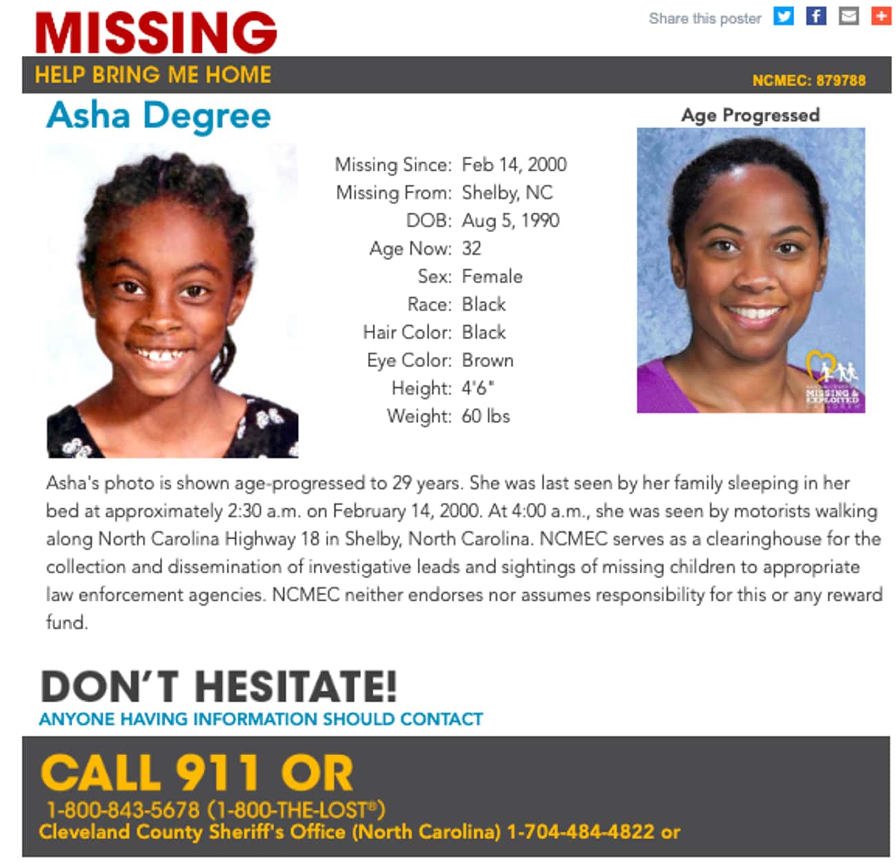女孩的家人仍然相信她还活着,并且案件也是公开调查。20多年后,阿莎的母亲Iquilla Degree告诉联邦调查局:
