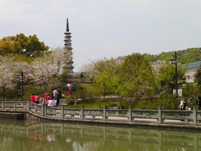 公园的核心白塔,与六和塔遥遥相望,白塔共九层,高约15米,平面八边形的楼阁式塔建筑,逐层划分,比例适度,出檐深远,起翘舒缓,轮廓秀丽挺拔。