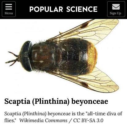 2012年,澳大利亚科学家新发现了一种罕见的牛虻(horse fly),将其命名为“碧昂丝(Scaptia beyonceae)”。因为这种牛虻不仅身材曼妙,而且下腹部密布着金黄色细毛,研究人员形容其为“苍蝇界古往今来第一天后”,所以,以此来向流行音乐天后碧昂丝致敬。